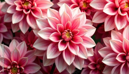 Close-up dahlia flower pattern, showcasing intricate petal details , pink, white