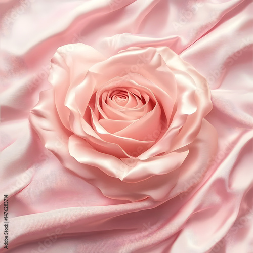 Close-up detail of a lovely pink rose bloom set against a draped pink silk satin fabric texture, excellent for beauty advertisement, wedding themes, and sophisticated print materials., background