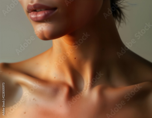 Close-up elegant woman neck. Smooth skin, natural contours. Soft warm light highlights natural beauty. Intimate, personal body detail. Perfect for skincare, wellness products fashion, beauty,