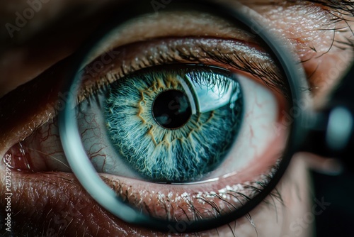 Close-up eye observation through a magnifying glass indoor setting macro photography detailed viewpoint concept of eyes and vision clarity