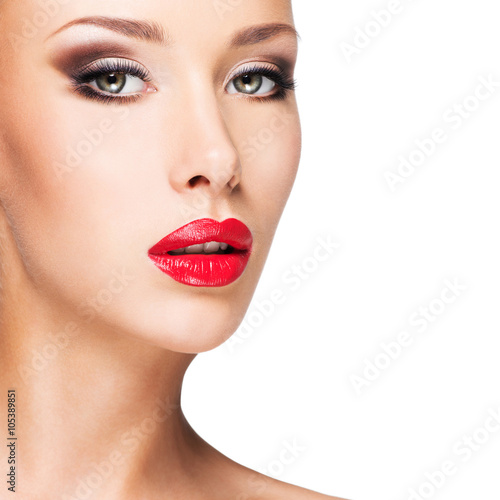 face, beautiful, make-up, woman, fashion, girl, beauty, red lips, sexy, pretty, female, portrait, glamour, style, stylish, young, closeup, fashionable, trendy, attractive, model, smokey, eye, posing, red, caucasian, isolated, white background