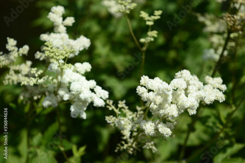 Closeup filipendula ulmaria - very ornamental plant with blurred background in damp meadow