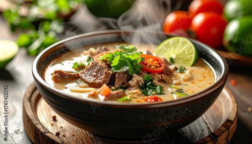 Close-up food footage of Soto Betawi in a ceramic bowl, creamy broth with beef, tomato, and lime garnish, steam visible, soft daylight