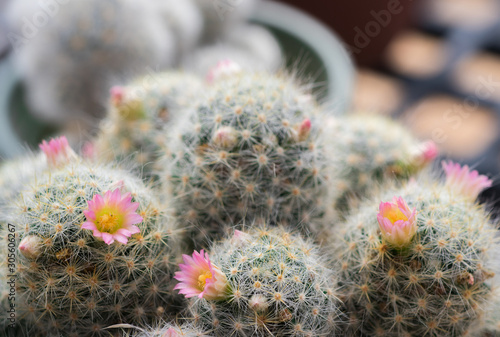 Closeup fresh small pink flowers of Cactus (Cactaceae) are blooming on spiky tree in the ornamental garden