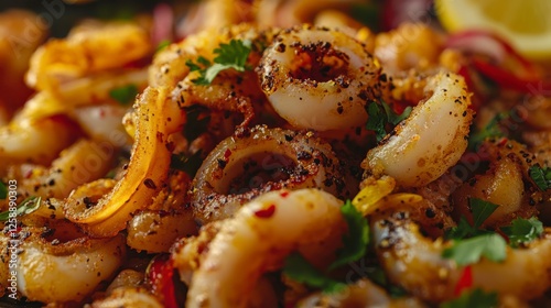 squid, seafood, food, cooking, dish, grilled, eatery, closeup, delicious, tasty, dinner, lunch, meal, plate, food photography, health food, crispy, spiced, vegetable, onion, red pepper, coriander, parsley, black pepper, garlic, lemon, oil, dark background, brown, orange, white, closeup, fresh, healthy, kitchen, home cooking, homemade