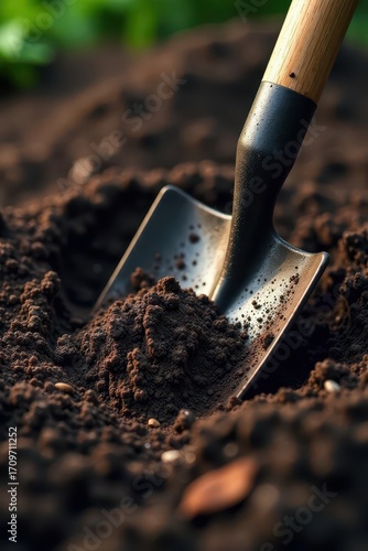 Close-up garden shovel in dark soil, wood chips, soil, detail, rustic
