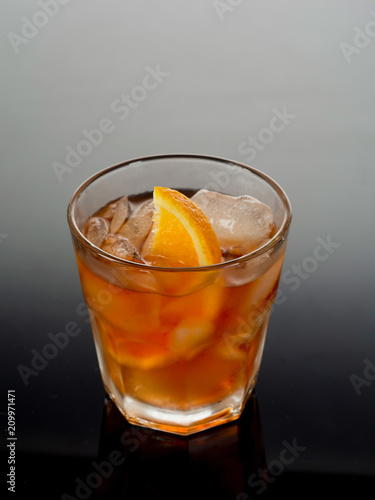 Closeup glass of negroni cocktail decorated with citrus on dark background.