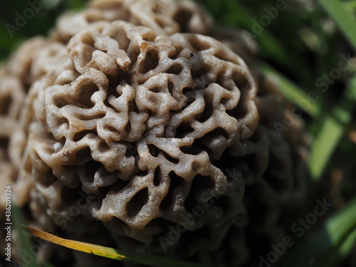 Closeup gyromitra mushroom in the grass, view from the top