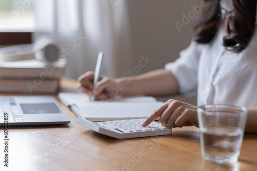 Closeup hands of businessman working on desk office with using a calculator to calculate the numbers, finance accounting concept