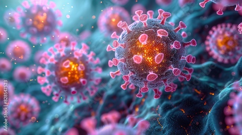 Close-up illustration of a virus particle, highlighting the intricate structure and vivid colors, representing contagious diseases.