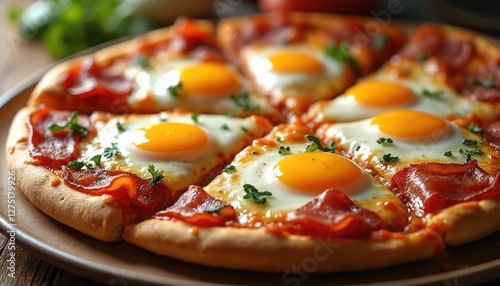 Close-up illustration of breakfast pizza with bacon, fried eggs and herbs. Italian cuisine brunch with crusty dough and tasty ingredients. Comfort food.