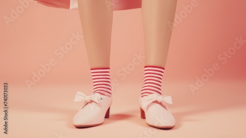 Close-up image of a person's legs in white shoes and striped socks, suitable for fashion or lifestyle concepts
