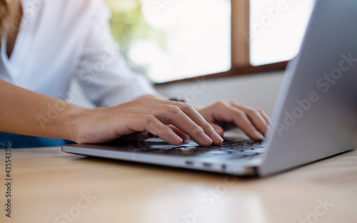Closeup image of a woman working and typing on laptop computer keyboard on the table