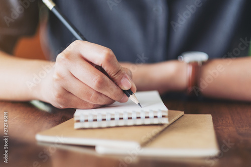 Closeup image of a woman's hand writing on blank notebook on wooden table