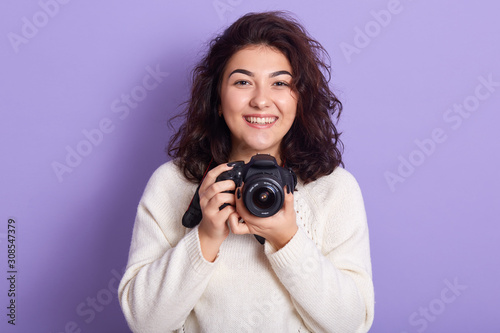 Closeup image of emotional happy curly haired female looking directly at camera, holding photocamera, getting pleasure from taking photos, wearing white warm sweater. People and hobby concept.