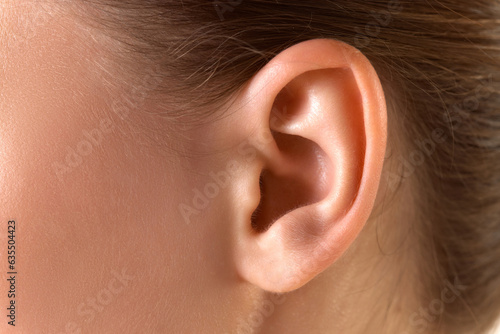 Close-up image of female ear. Taking care after health, visiting doctors, check up. Concept of female beauty, skin care, cosmetology and cosmetics, health, ad