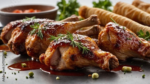 Close-up image showcases succulent glazed chicken drumsticks garnished with fresh rosemary sprigs, resting on dark surface with scattered herbs, sauces adding to gourmet presentation.