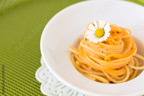 summer, spaghetti, pasta, food, italy, healthy, diet, take off, noodle, food, small, serving, plate, white, green, daisy, daisy, flower, romantic, background, serving, elegant, austere, simply, italian, kitchen, cooking, tiny, yellow, orange, slim, low-fat, hale, fast, spring, daisy, daisy, closeup, close-up view, macro