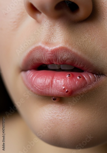 lip, skin, blemish, piercing, closeup, detail, realism, texture, photo, macro, beauty, aesthetic, medicals, health, artistic, intense, stark, realistic, image, portrait, woman, face, mouth, blemish, wound, redness, inflammation, body, visual, art, graphic, style, commercial, marketing, advertising, product, sale, design, model, studio, professional