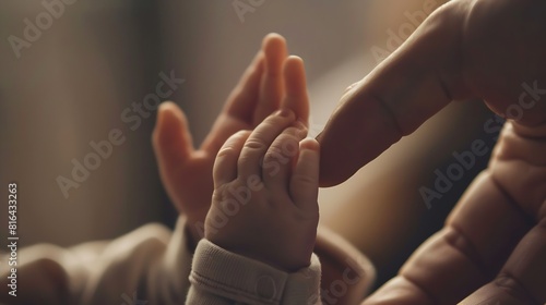 Closeup little hand of child and palm of mother and father The newborn baby has a firm grip on the parents finger after birth A newborn holds on to moms dads finger : Generative AI