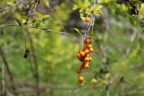 close-up macro cluster of orange brown fruit berries dangling from slender stems in morning sunlight