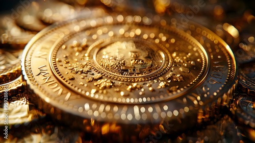 Close-up Macro Photo of Golden Bitcoin with Bokeh Lights