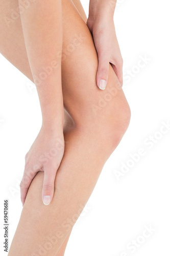 woman, part of, closeup, white background, standing, pain, touching, painful, health, body, leg, knee, holding, lifestyle, isolated, cut-out, fit, toned, fitness, physical, shape, athletic, slim, slender, attractive, beautiful, wellness, bodycare, injury, hand, bone, injured, leg, calf