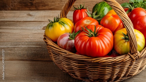 Close-up of a basket overflowing with heirloom tomatoes, each with distinct textures and colors, in a rustic wooden setting