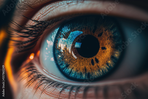 Closeup of a beautiful human eye, zoom on blue and brown iris illustration created by generative AI.