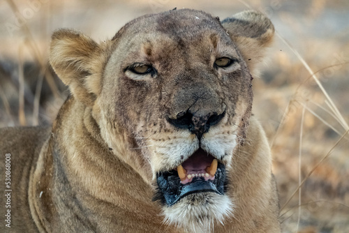 Close-up of a beautiful lioness resting after hunting