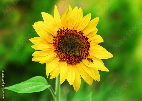 Close-up of a beautiful sunflower and bee in a field