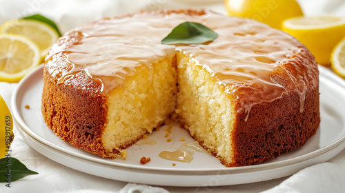 close-up of a beautifully glazed lemon cake on a white ceramic plate
