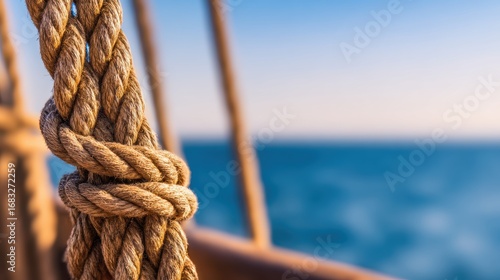 Close-up of a beautifully tied rope on a sailing boat with a serene ocean view in the background