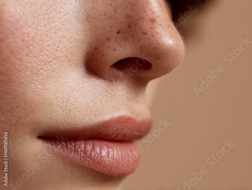 close-up of a beauty mark on smooth skin, framed with soft shadows, photorealistic, isolated on light tan background