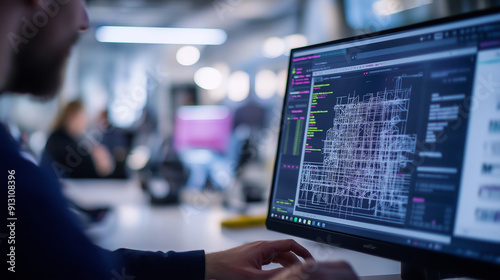 closeup, construction, technology, design, architecture, digital, visualisation, collaboration, planning, engineering, drafting, analysis, teamwork, tool, software, accuracy, efficiency, communication, coordination, innovation, datum, progress, building, schematic, blueprint, development, improvement