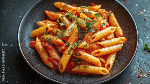 Close-up of a black plate filled with penne pasta coated in tomato sauce and garnished with fresh chopped parsley and herbs on a dark surface