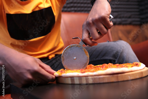 Close-up of a black young man's hands cutting pizza into pieces. Unrecognizable photo. Copy of the space.