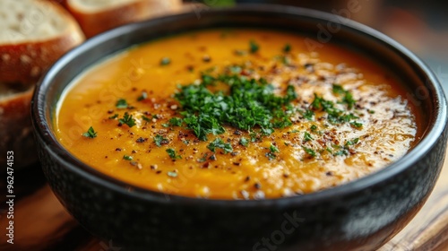 Close-up of a bowl of creamy pumpkin soup garnished with parsley and pepper, served with bread.