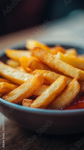 Close-up of a bowl of golden-brown French fries with ketchup.