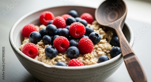 Close-up of a Bowl of Oatmeal with Raspberries and Blueberries