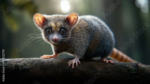 Close-up of a bushbaby on a tree branch, showing its large eyes and fluffy fur in a natural forest setting, with soft light filtering through the trees.