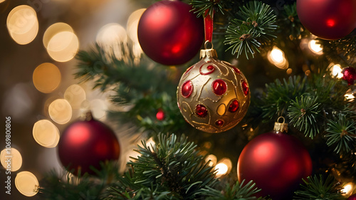 Close-up of a Christmas tree branch adorned with classic red and gold ornaments, twinkling fairy lights, and a touch of glitter, with a soft bokeh effect in the background to emphasize the holiday