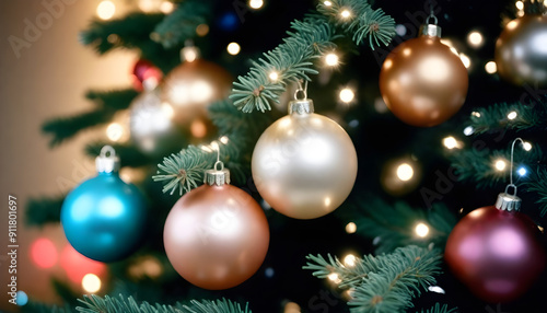 Close-Up of a Christmas Tree Branch Decorated with Shimmering Ornaments and Softly Glowing Lights Creating a Warm and Festive Ambiance