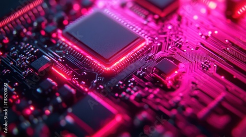 Close-up of a circuit board with a central processor chip, highlighted with vibrant pink neon light.