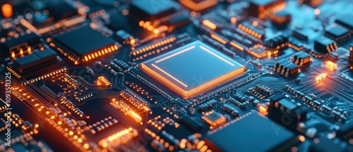 Close-up of a circuit board with glowing components, showcasing technology and electronics.