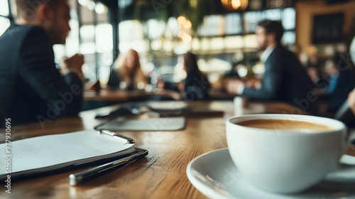 Close-up of a Coffee Cup and Notepad on a Wooden Table with Blurred Background of People in a Cafe