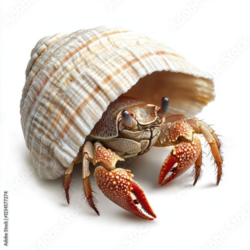 Close-up of a colorful hermit crab emerging from its shell against a clean white backdrop, showcasing its intricate details and textures