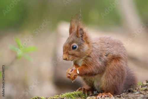 Closeup of a common squirrel (Sciurus vulgaris) on a trunk of a tree against blurred background