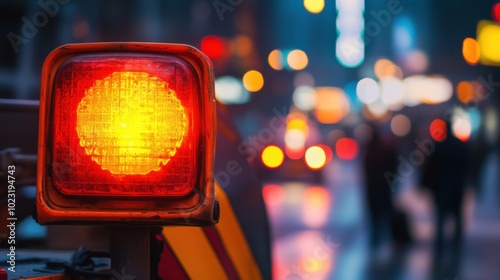 Close-up of a construction vehicle's amber siren flashing brightly, illuminating the nighttime city street, with pedestrians walking by. Roadwork alert in the area.