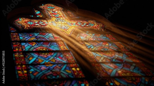 Closeup of a cross shaped stained glass window, illuminated by sunlight, symbolizing the divine light and beauty found in the teachings of Jesus.